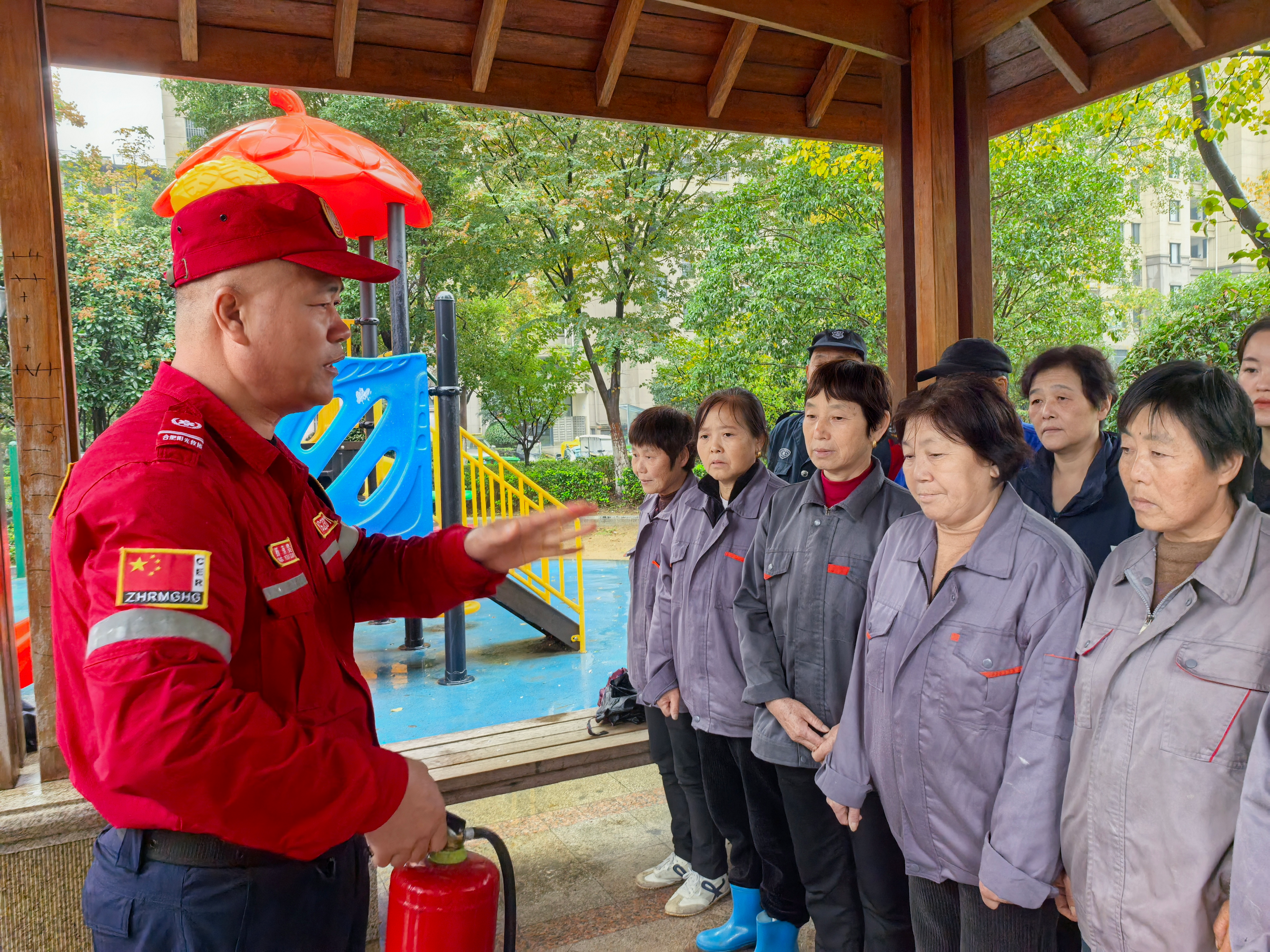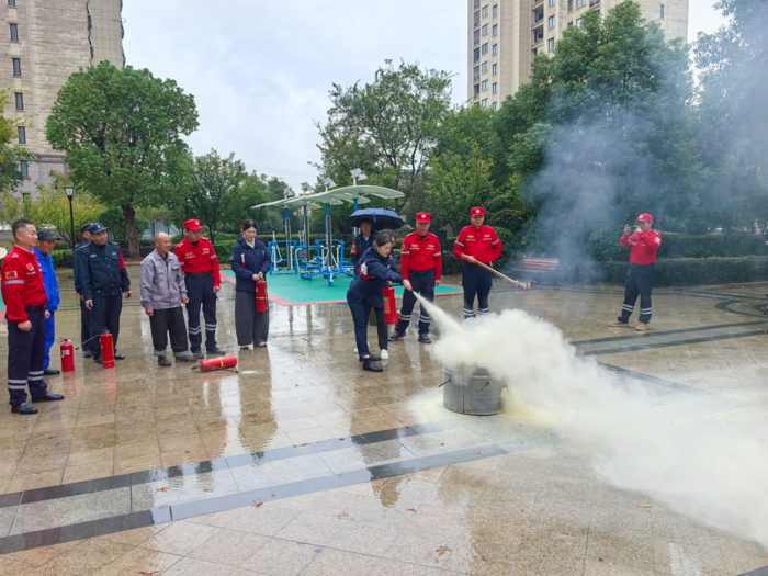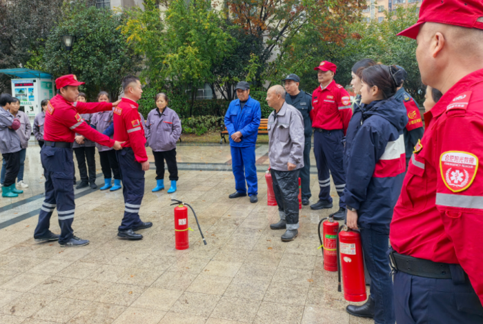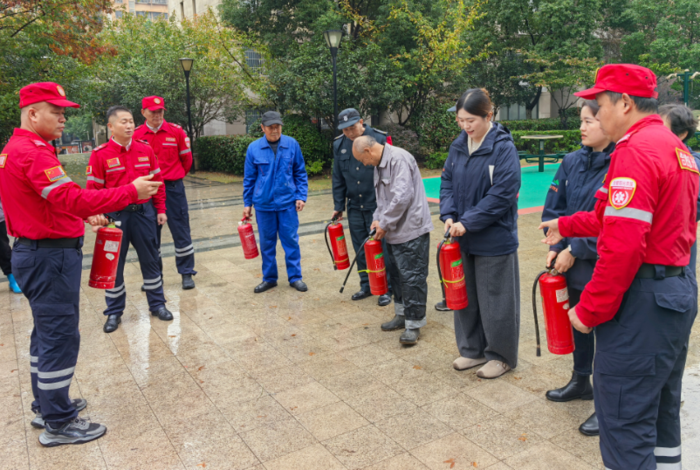 在瑞阳公馆,物业负责人廖开朗热情接待了大家,并安排了物业工作人员参与培训,共同提升应急救援能力。队长杨有贵耐心向物业工作人员逐一阐释了灭火器的各项性能特点,并详细示范了其正确的操作步骤,确保每位在场人员都能熟练掌握灭火器的使用方法。